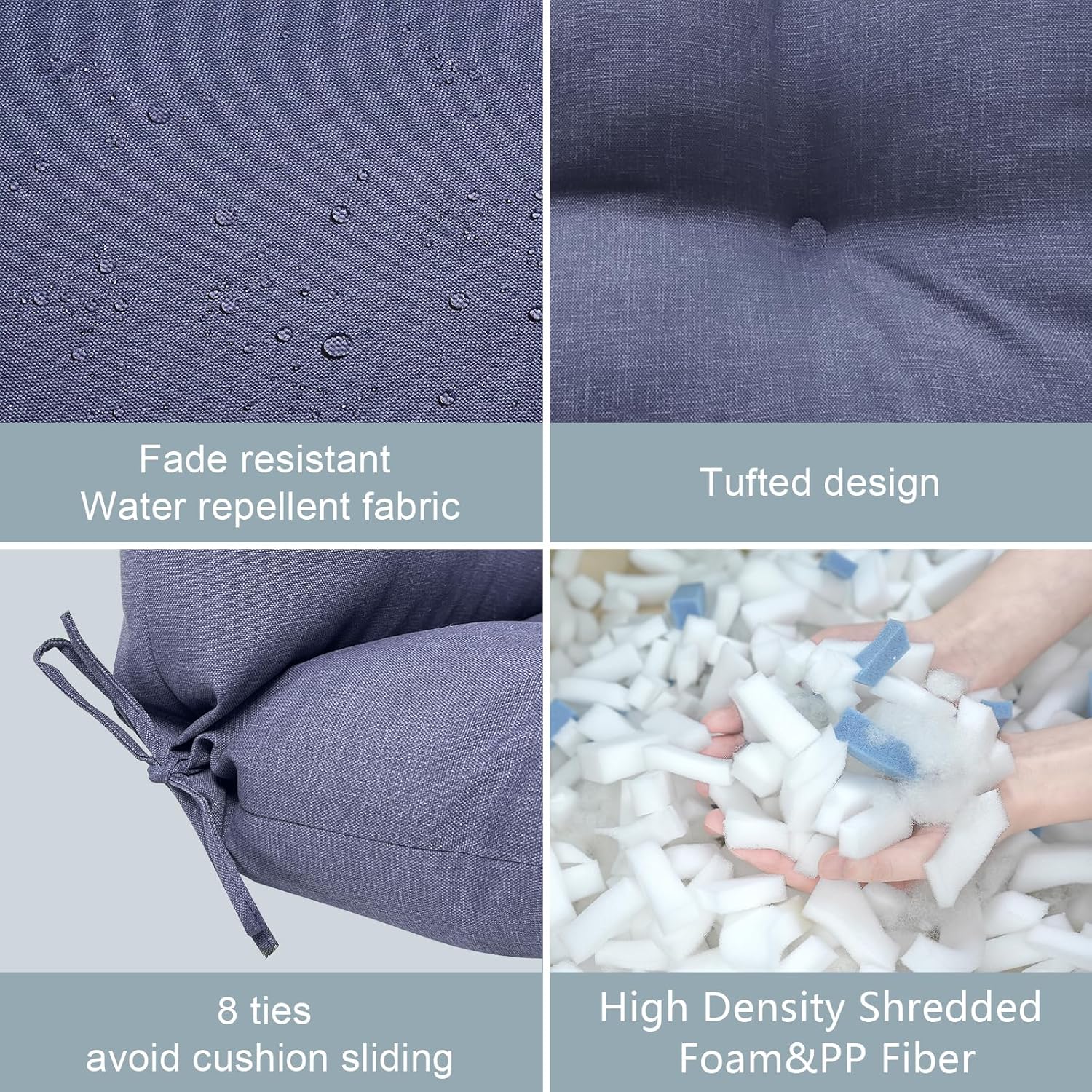 - Material: 100 percent durable polyester fabric and high-quality recyclable poly batting. It’s water repellent, fade resistant, dirt and stain resistant, won’t fade under the sun for 500 hours. It is filled with soft PP fiber, overstuffed construction for enhanced comfort and longevity.