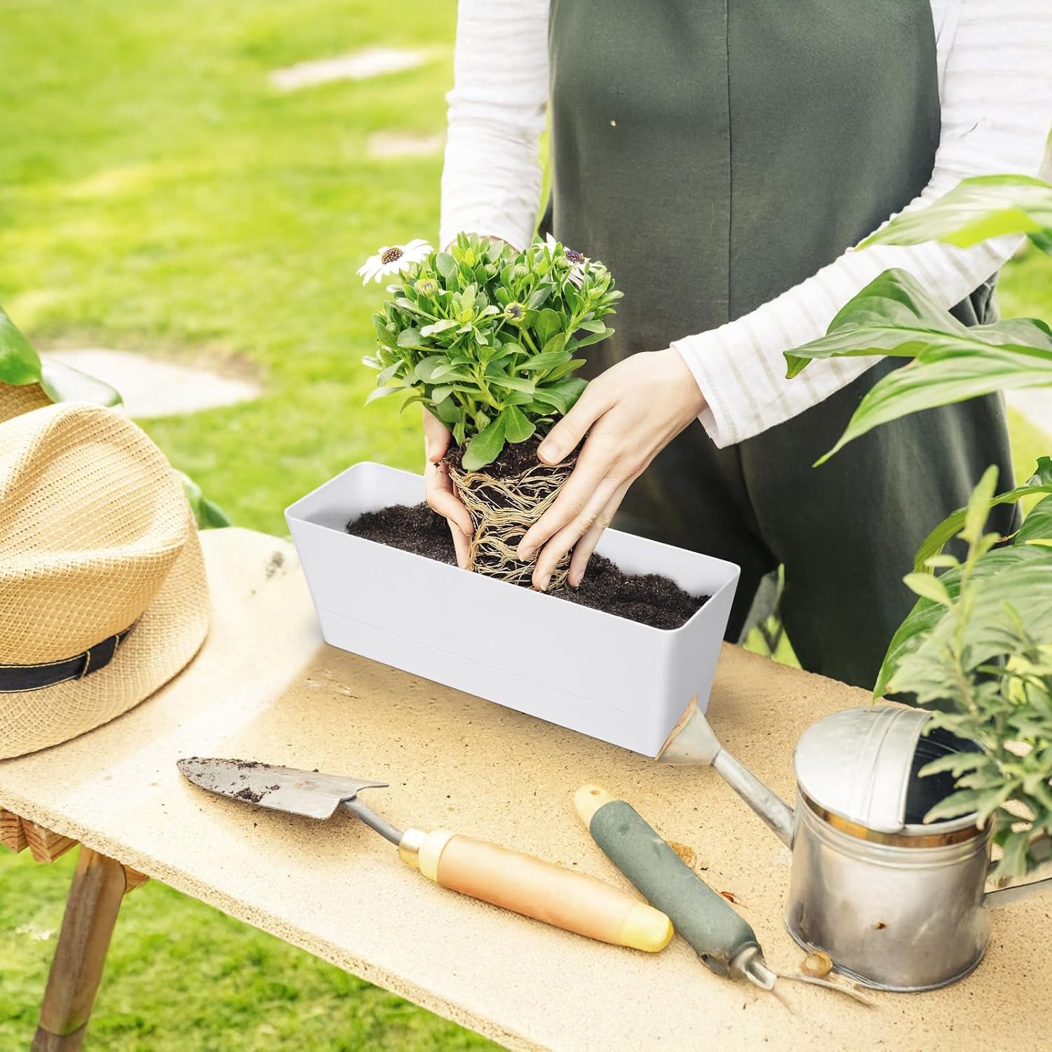GREANER Flower Boxes, 3 Pack 12x3.8 Inch Rectangle Window Boxes, Herb Planters with Tray, Indoor Succulent Cactus Flowers Plastic Drawable Pot for Windowsill, Garden, Balcony, Office Outdoor (White)