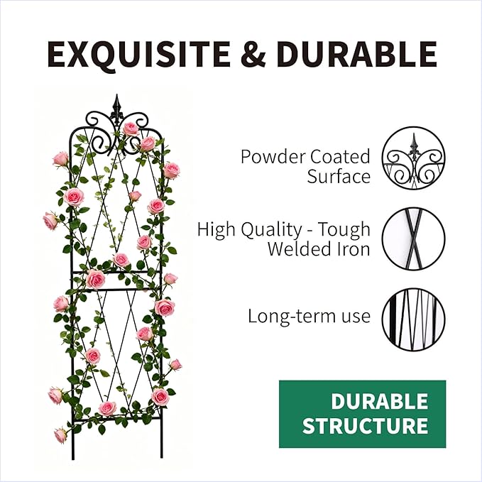 - [Sturdy Stability Structure]: With heavy duty iron frame and powder coated welded material. 6.3 inch ground spike inserts into the ground and add stability to the trellises.