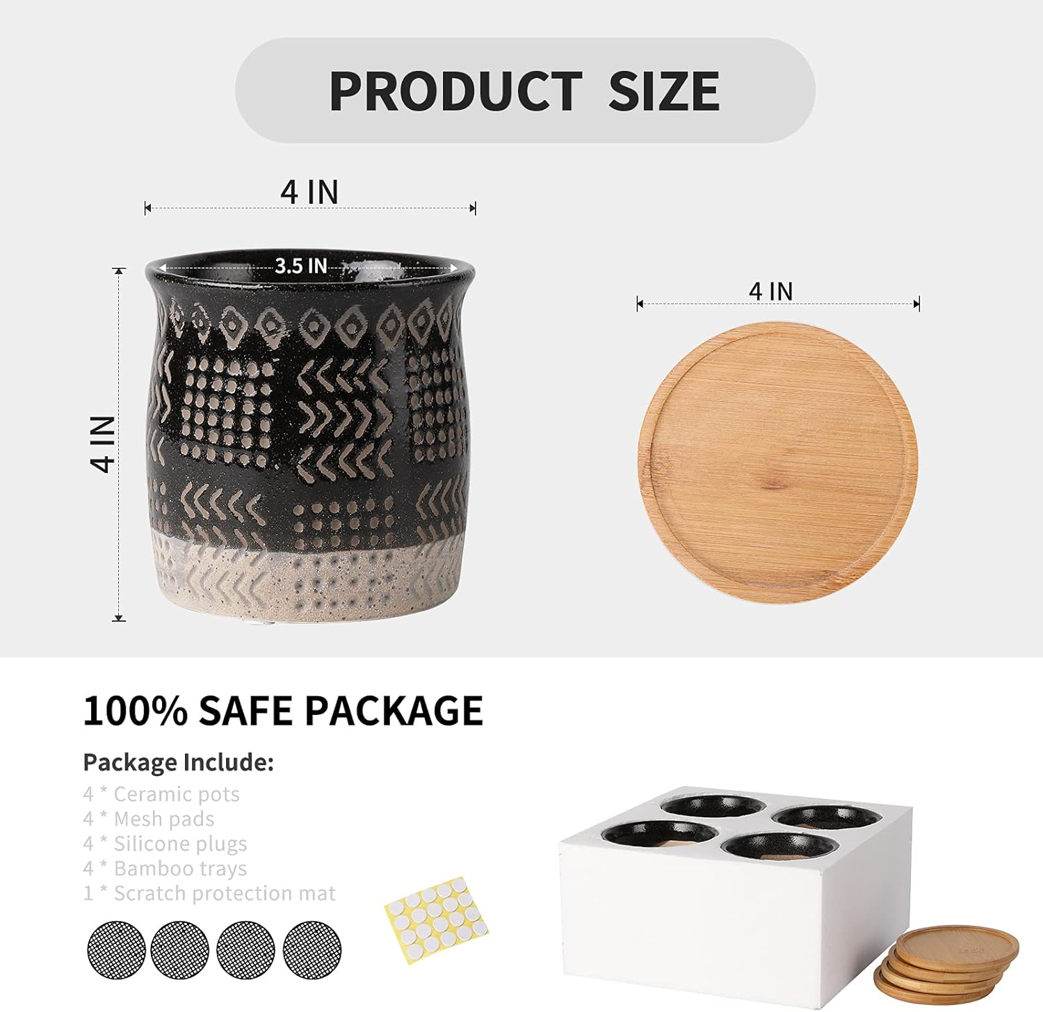 OMAYKEY 4 Inch Ceramic Plant Pot with Tray, Retro Black Small Planters Pots with Drainage Hole & Mesh Pads for Succulent, Indoor Flowers, Snake Plants, Cactus, Herbs, Aloes - 4 Packs
