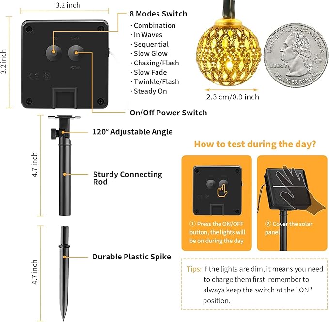 - 【Energy-Saving & Durable】Please Power ON the outdoor solar globe lights first before charging and it will be charged automatically, ensure the solar panel is in a sunny location. Crafted from premium materials, this solar string lights is designed to withstand years of use.