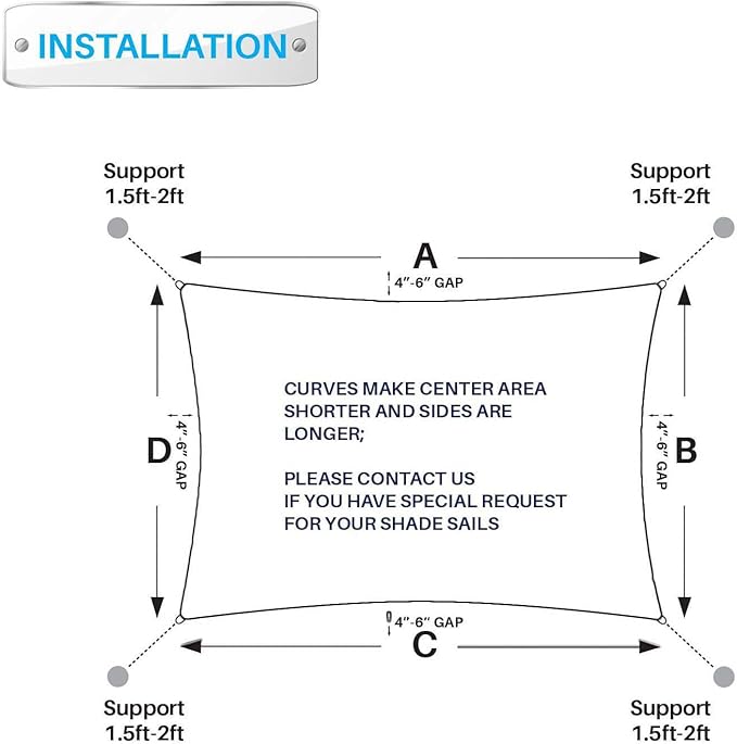 - Note: A space of 1.5-2 feet should be left between the D-ring and the mounting point for installing hardware. The fabric is stretchy; the titles shown are for when stretched taut. Make sure the sunshade sail is fully taut during installation, otherwise the size will be too small. Alternatively, choose a larger size