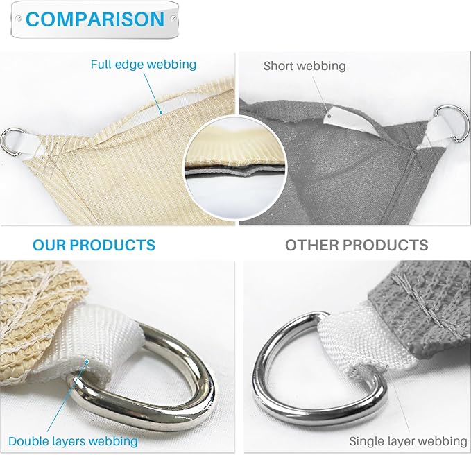 - Thick Material: Compared to other sun shade sails on the market, our virgin HDPE fabric undergoes 20000 hours of laboratory testing and it is proven to be 80% more durable than low purity HDPE under sun exposure. The fabric surface has undergone special treatment, making it more durable in both sunlight and rain