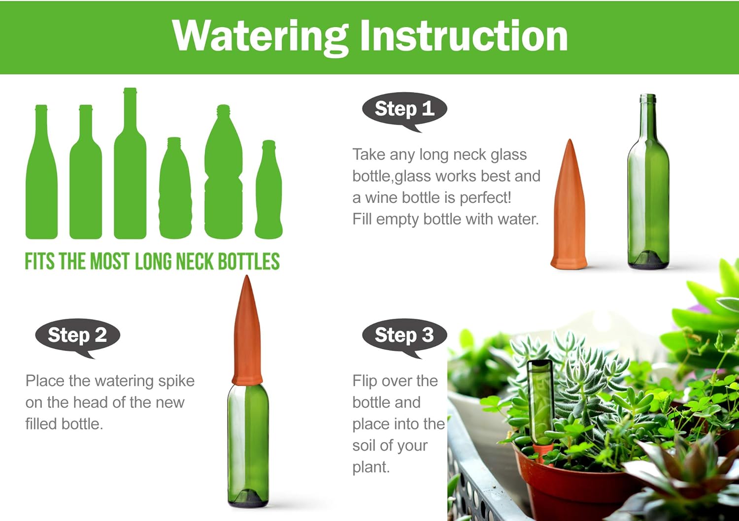 - [EASY TO USE] Just recycle any long neck bottles, such as wine bottle, glass beer bottle, soft drink bottle etc., not need any more fittings required. Place this device into soil then stick with bottle full of water, that's all.