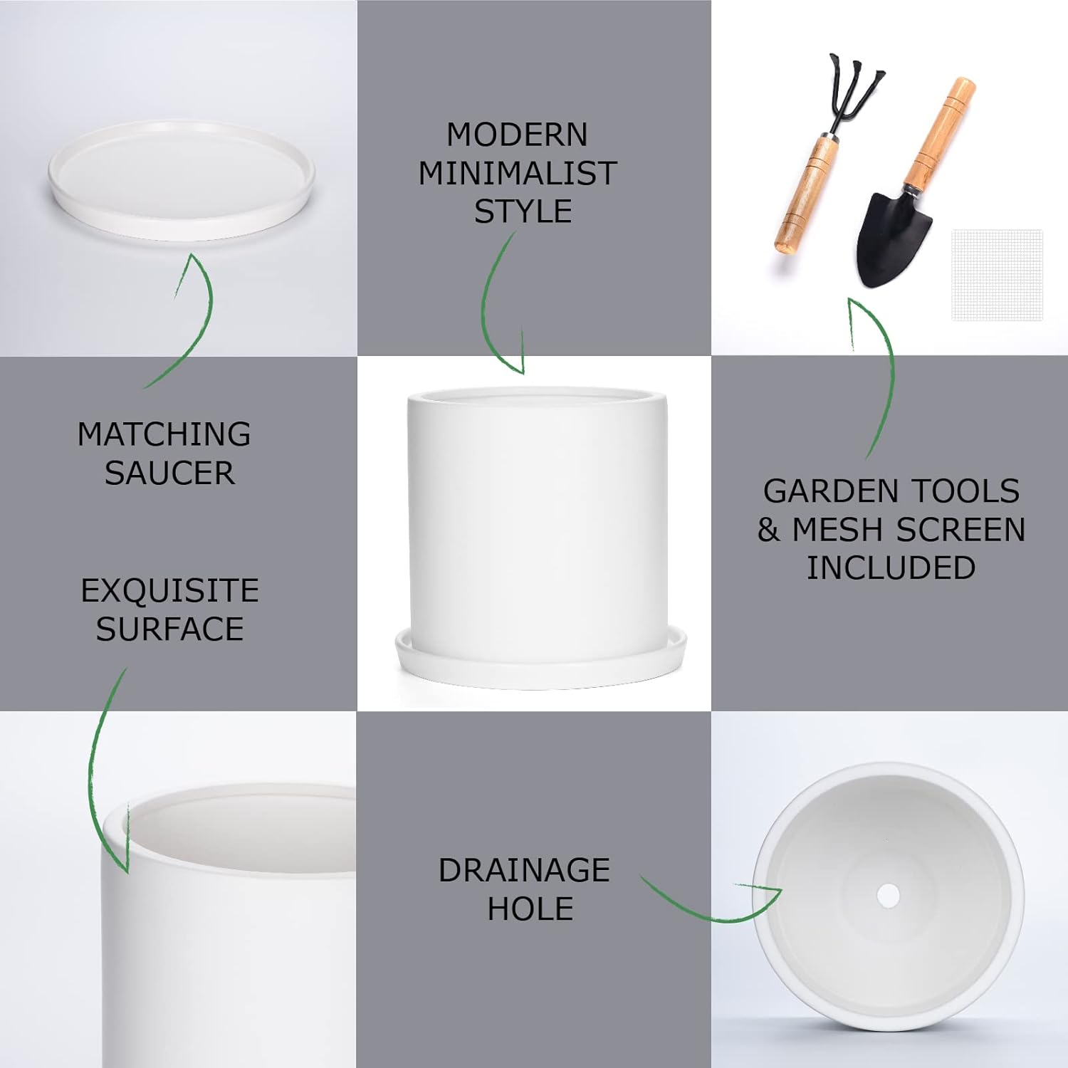 - <p>đ”</p>ăDrainage System & Matching SaucerăEach plant pot comes with pre-drilled drainage holes, a mesh drainage screen, a matching saucer and a garden tool kit. The drainage hole allows excess water to flow out, which promotes healthy and thriving plants. The matching saucer design holds excess water and is easy to fill or remove for better care of your plants.
