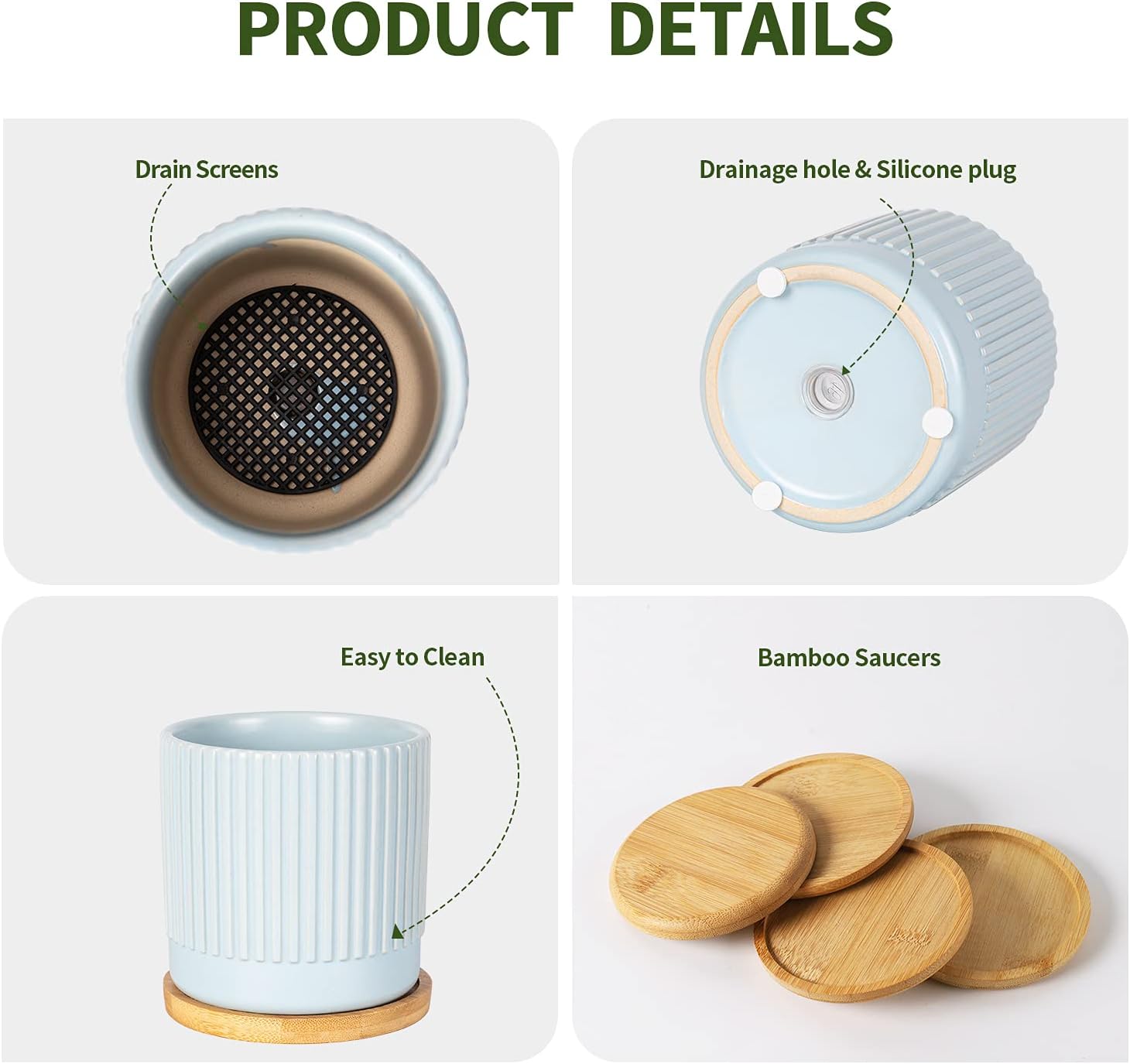 - Drainage Hole and Saucer: Plant pots with drainage hole can flow out the superfluous water. And tray can collect the superfluous water, it is suitable for garden, yard, patio, windowsill, office, living room, bedroom, tabletop, etc. (Plants NOT Included)
