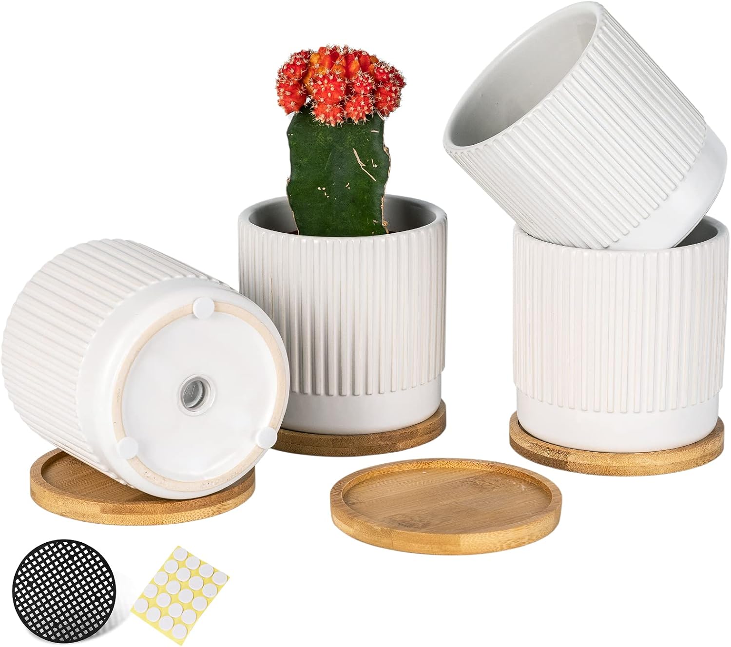 AOMRYOM 4.25 Inch Small Ceramic Plant Pots with Drainage Holes and Trays, Garden Flower Pots for Indoor Outdoor Plants, Succulents, Cactus and Herbs, White Stripe, Set of 4 (Plant Not Included)