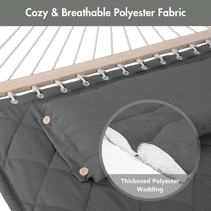 ANOW 2 Person Hammock with Spreader Bars and Detachable Pillow, Quilted Hammock for Outdoors Indoors, 450 LBS Weight Capacity, Gray
