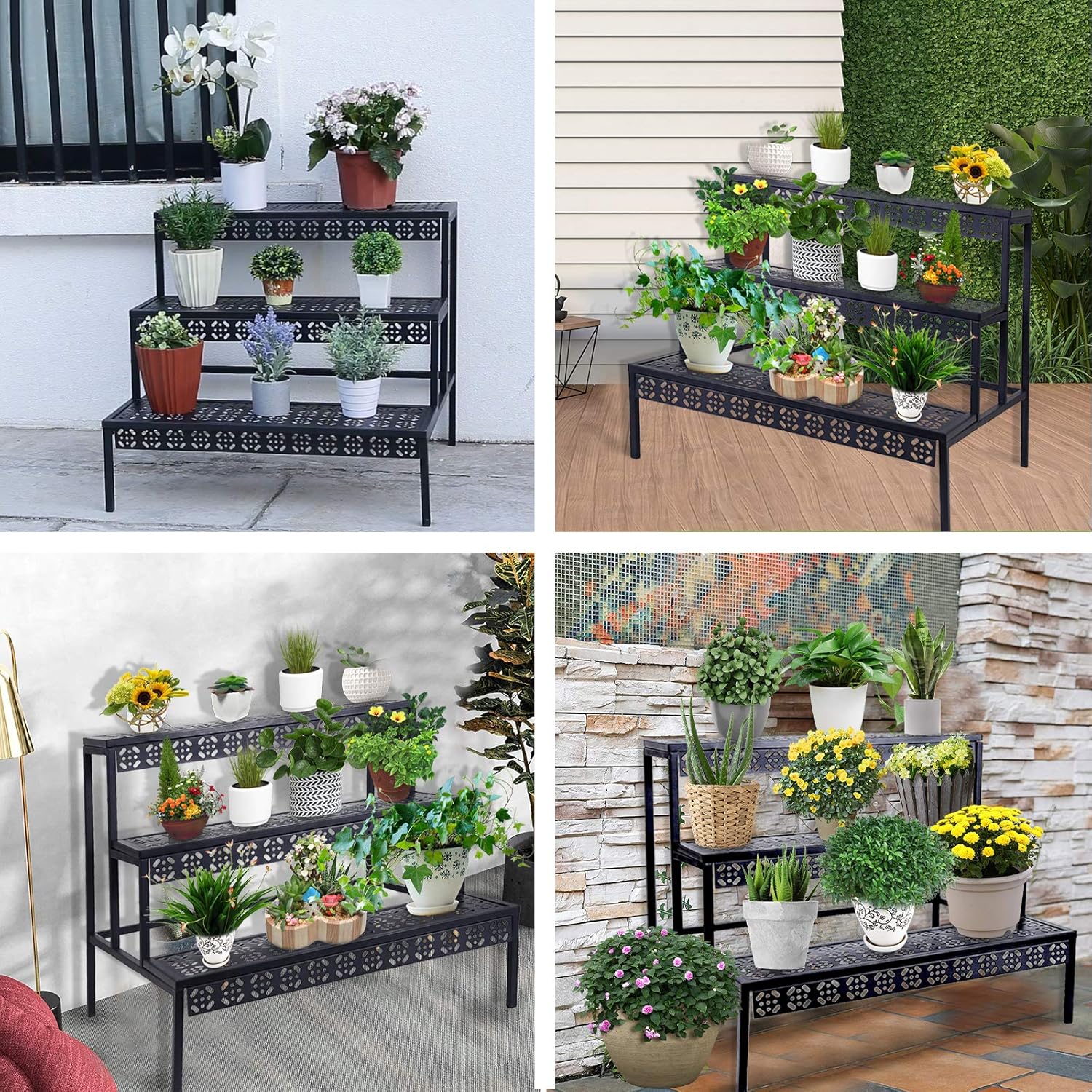- 【Indoor and Outdoor Use】Featuring with an elegant and retro design, this flower stand can well match your home decor. Versatile plant stand with delicate patterns can be used both indoor and outdoor.The product is considered for the planting of customers, the height of each layer to ensure that each plant can have enough sunlight environment fully irradiation, carefully designed storage space iron frame, unique retro pattern design let you master the spacing of plants, thrive.