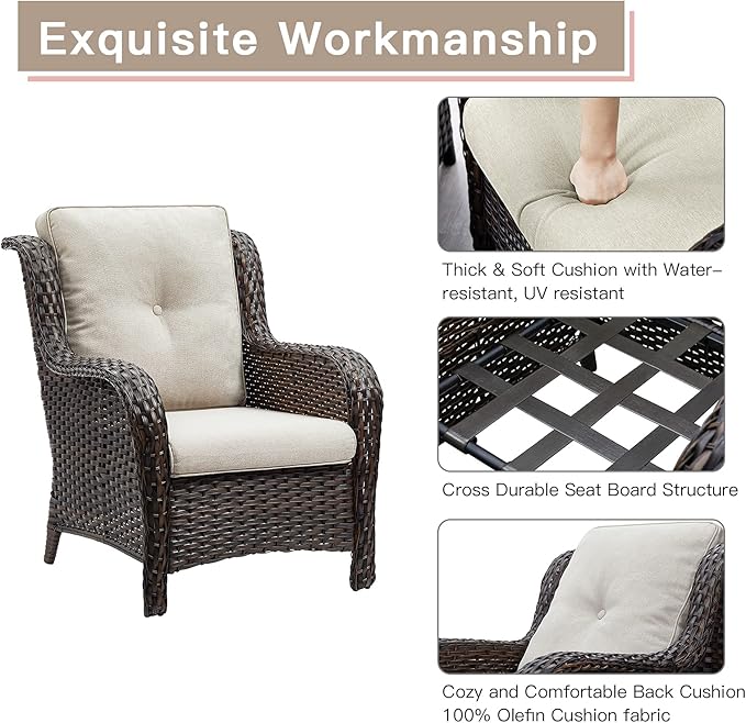 - 【Deep Seating & Comfort Cushions】This outdoor chairs feature deep and wide seats with 4-inch thick sponge-padded cushions create the ultimate patio seating experience.The whole piece of sponge padding and the curved cushion design on the edge make the wicker single chair looks elegant and comfortable.