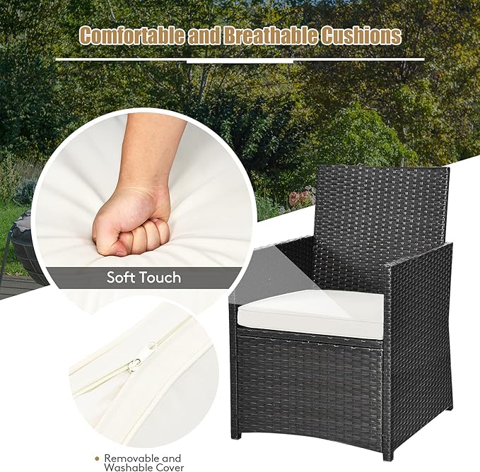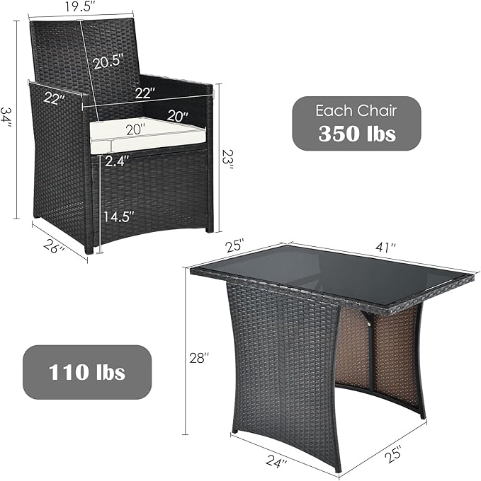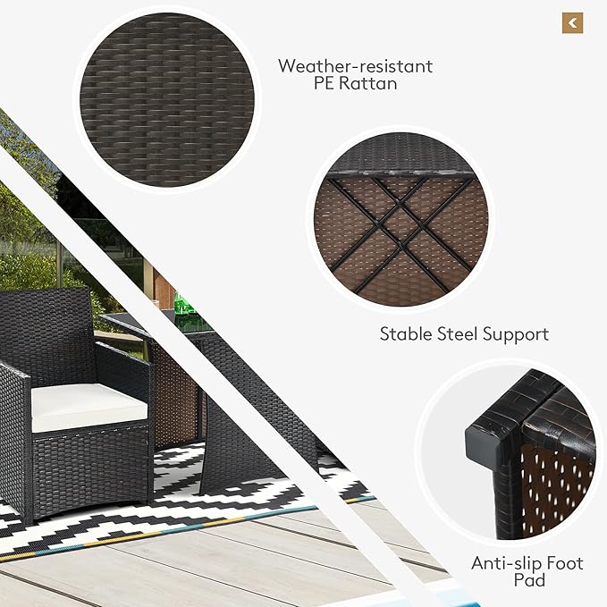 - Selected Materials: Made of rustproof steel frame wrapped with weather-resistant PE rattan, this patio bistro set allows you to leave it outside. Meanwhile, tempered glass is studier and safer than other common glasses. And, both table and chairs have non-slip foot pads for additional stability.
