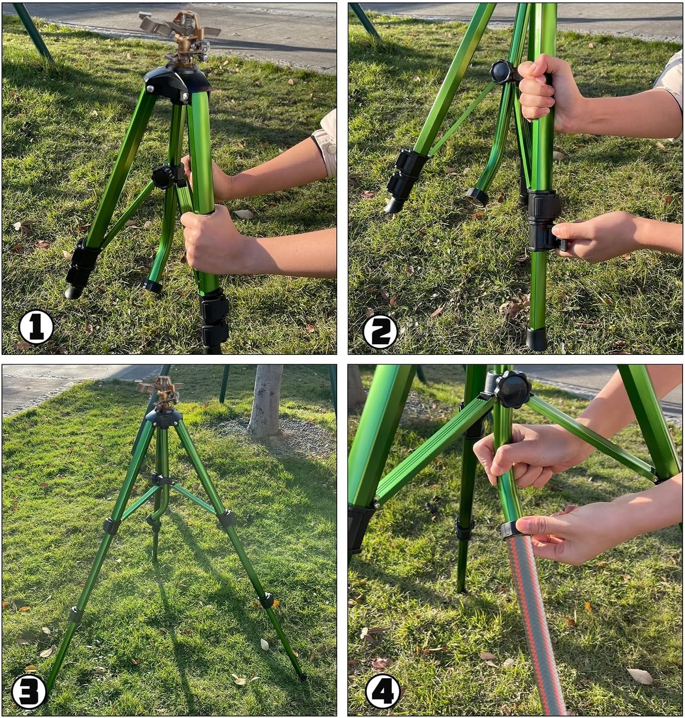 - IMPACT SPRINKLER HEAD: Heavy duty lawn impact sprinkler with tripod base for yard, lawn and grass Irrigation. The sprinkler head can rotate freely for nearly 360 degrees. Adjust the spray range and radian of water to make the irrigation in the garden fun.