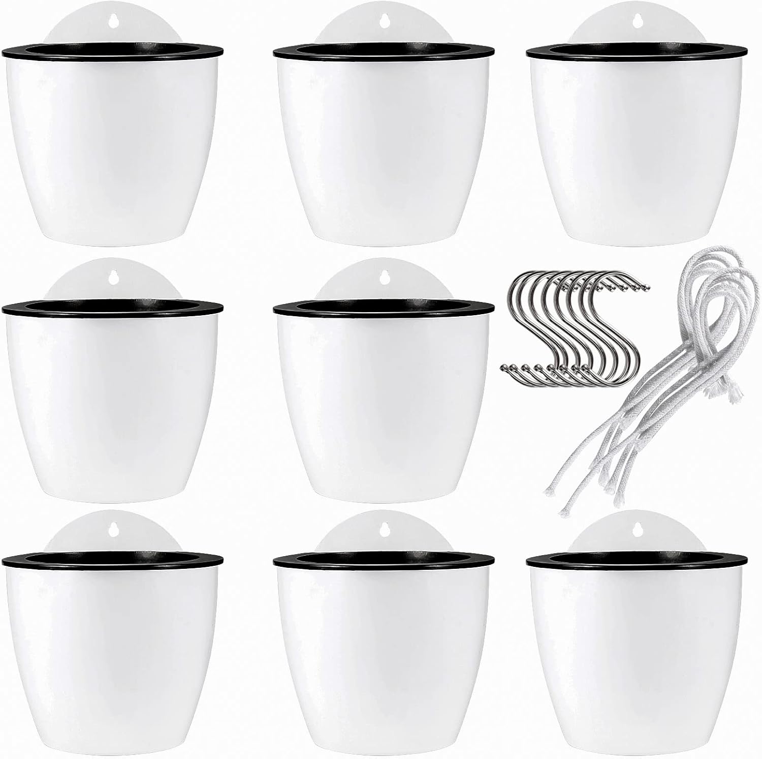 JAPCHET 8 Pack 7 Inch Self Watering Hanging Planters, Wall Hanging Plastic Planter Pot with 8 Hooks, Lazy Flower Pots for Indoor Outdoor Window Wall Plants, White