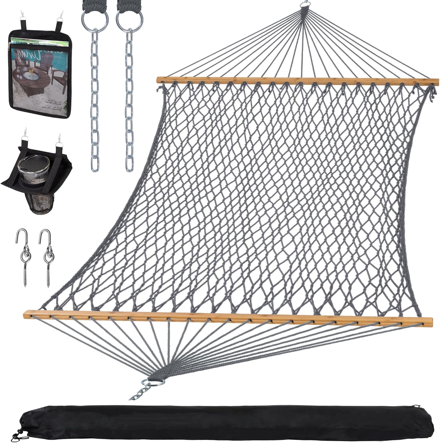 SUNCREAT Double Outdoor Hammock, Polyester Rope Hammock with Strong Spreader bar, Gray