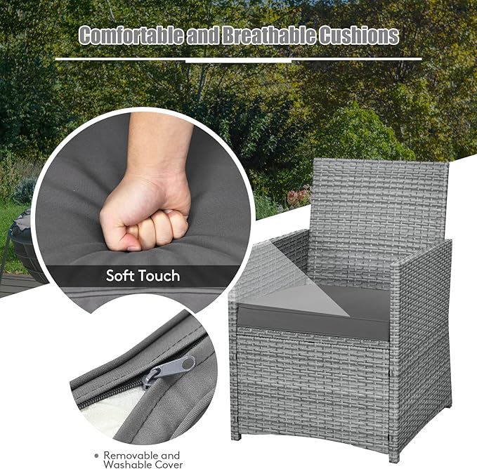 Tangkula 3 Pieces Patio Dining Set, Patiojoy Space-saving PE Rattan Bistro Set with Tempered Glass Top Table and Cushioned Chairs, Outdoor Conversation Set for Garden, Backyard, Poolside, Porch (Gray)