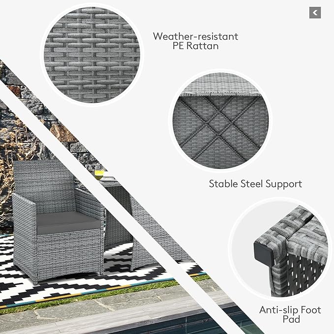 - Selected Materials: Made of rustproof steel frame wrapped with weather-resistant PE rattan, this patio bistro set allows you to leave it outside. Meanwhile, tempered glass is sturdier and safer than other common glasses. And, both table and chairs have non-slip foot pads for additional stability.