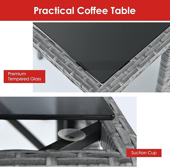 - 【Easy Maintenance】 Considering your convenience, the covers of cushions can be removed so that you are able to clean it with ease. Furthermore, the smooth tempered glass tabletop is also easy to maintain. Dimension of each chair: 26” x 22” x 34” (L x W x H), dimension of table: 41” x 25” x 28” (L x W x H), seat height from the ground: 16.5”.