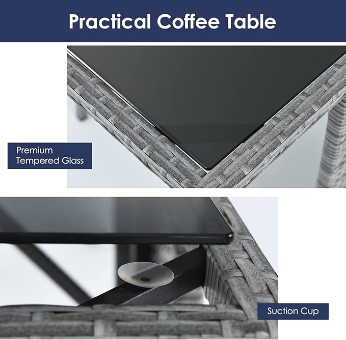 - 【Easy Maintenance】 Considering your convenience, the covers of cushions can be removed so that you are able to clean it with ease. Furthermore, the smooth tempered glass tabletop is also easy to maintain. Dimension of each chair: 26” x 22” x 34” (L x W x H), dimension of table: 41” x 25” x 28” (L x W x H), seat height from the ground: 16.5”.
