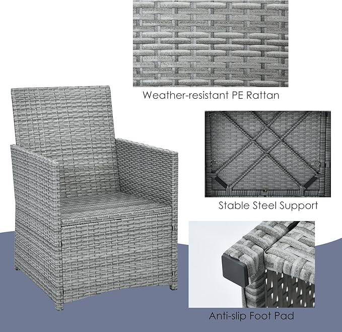 - 【Sturdy Construction】 Constructed of heavy duty steel frame with powder coated, this outdoor conversation set is rustproof yet sturdy to hold up to 110 lbs for table and 350 lbs for each chair. The weather-resistant PE rattan wraps the frame, which makes it withstand changeable weather. The non-slip foot pads ensure structural stability.
