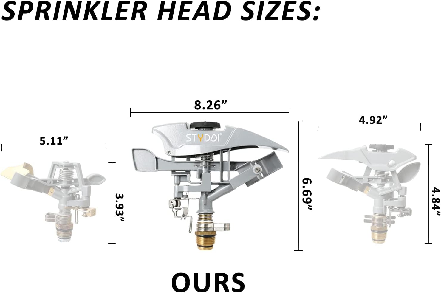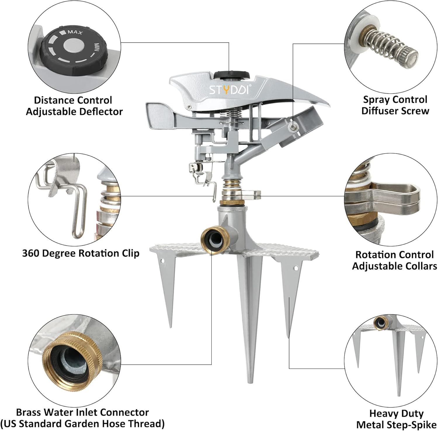 STYDDI Professional Heavy Duty Pulsating Sprinkler on Metal 3-Pronged Step Spike, Metal Pro Adjustable Circular Sprinkler for Large to Extra Large Yard, Areas, Lawn, Coverage up to 8500 Sq.FT