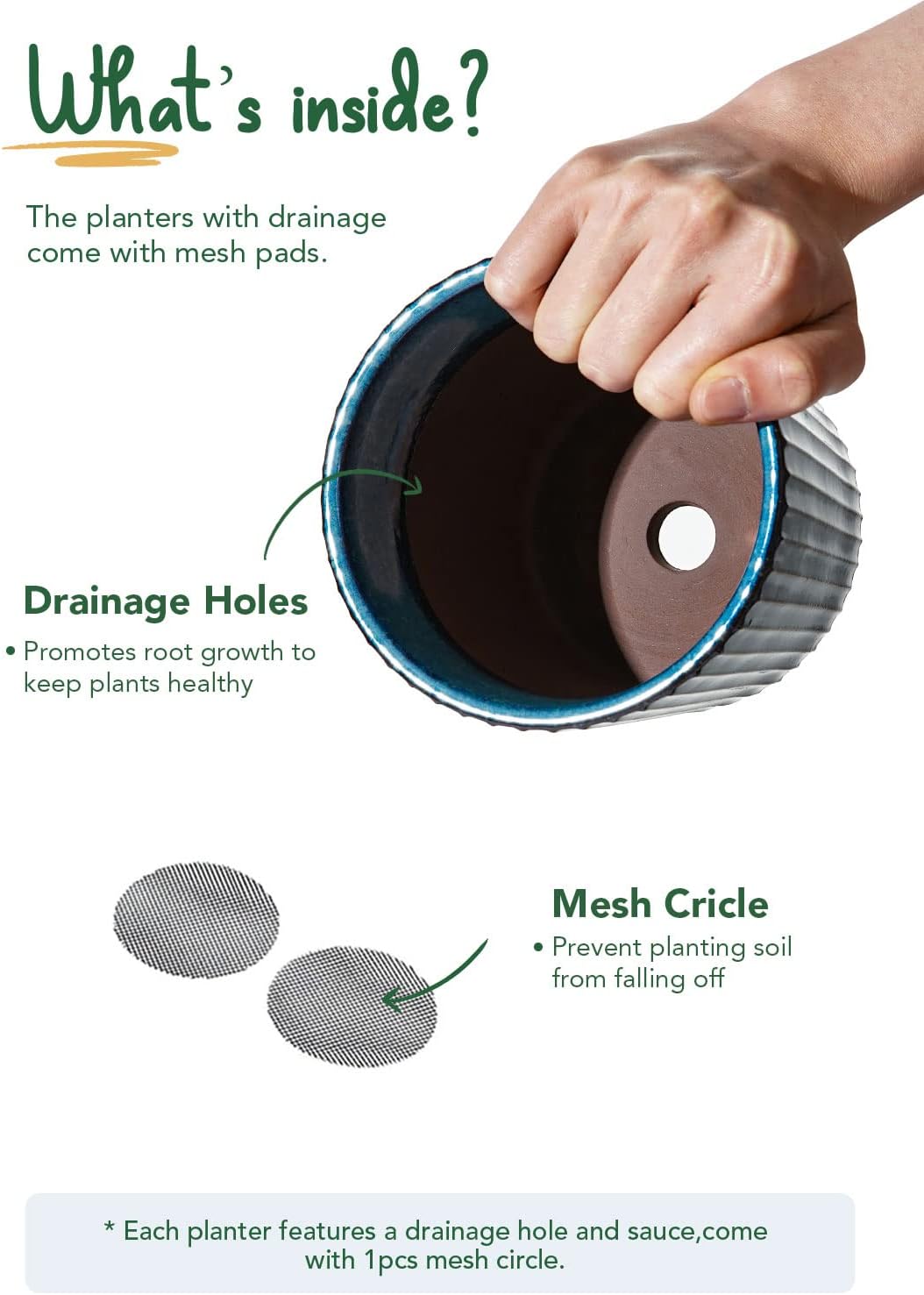 - Thoughtful Accessories: These indoor plant pots are equipped with drainage holes and saucers, ensuring proper drainage to prevent root rot. The saucer helps to catch any excess water and prevent leaks, while the mesh pad retains soil and promotes optimal ventilation. (Plant not included)