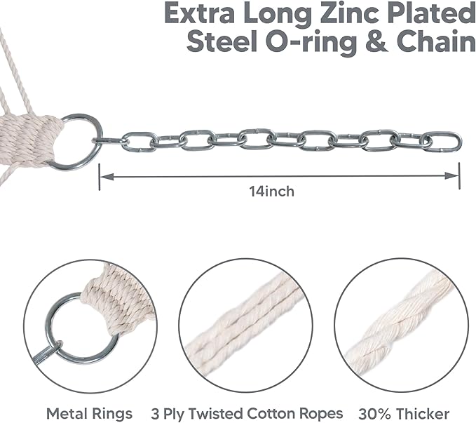 - Upgraded 30% Thicker Ropes: The upgraded strong poly-cotton ropes are hand-woven with comfortable, long-lasting threads woven by the hammock artisans, 30% thicker than before. The 20 ropes are collected together and woven into a triangle pattern which is pleasing to the eye. O-shaped steel ring attaches the ropes and the chain