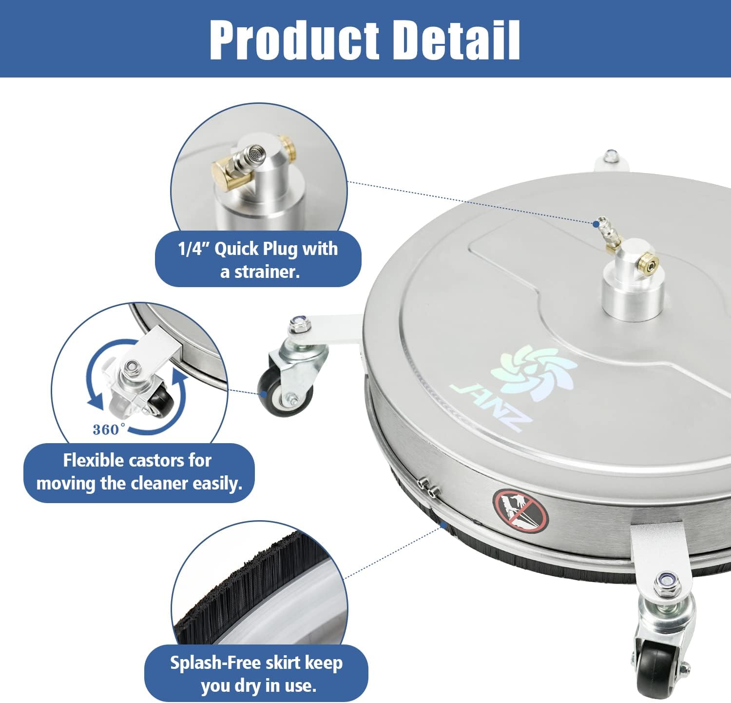 - HIGH QUALITY - The newly upgraded nozzles are effortless to remove and maintain. The durable stainless-steel structure with a heavy-duty bearing can be utilized for a long period. It is heavy enough not to rise up under high pressure, is easy to control, and saves your effort. The splash-free skirt decreases overspray and keeps you dry while cleaning.