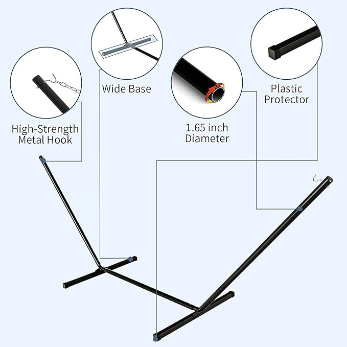 - 👍【Heavy-duty Stand & Durable Fabric】 Our hammock stand is made of premium thick steel pipes with coated surface, make it durable and sturdy. The wide base with anti-skid feet will increase the overall balance. Plus, the mat itself is characterized by its tear-resistant and hard-wearing fabric.