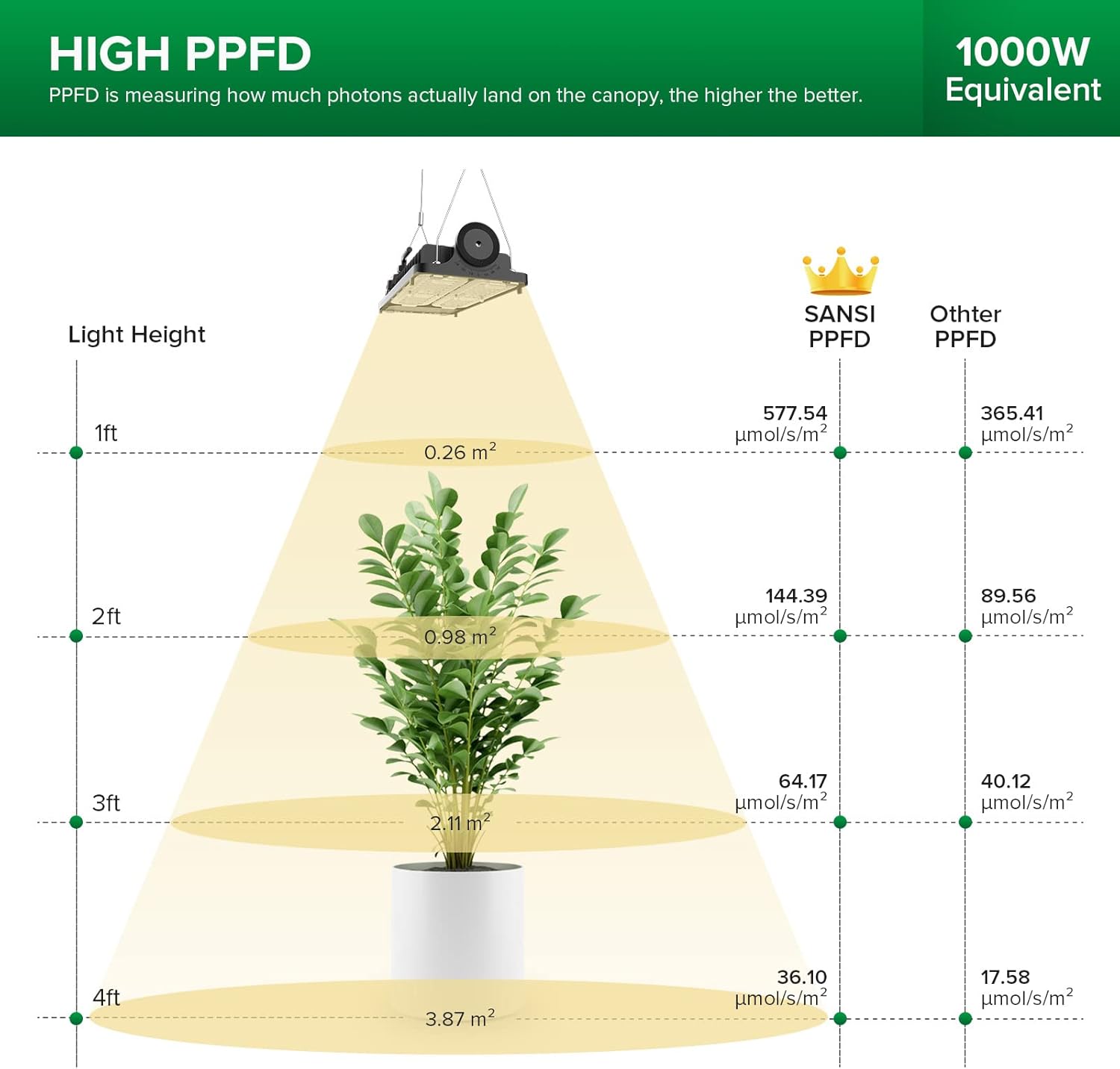 - HIGH EFFICIENCY- PPF: 158 μmol/s, PPFD: 577.54 μmol/s/㎡@1ft. Through the lens for secondary scientific light distribution, improves light utilization, giving plants more supplementary light. Using only 100 watts of power, equivalent to 1000W incandescent bulbs. Based on 18 hours per day usage, save up to 90 percent of electricity.