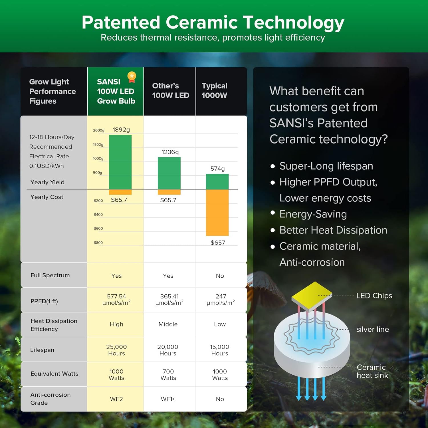 - 【PATENTED CERAMIC TECHNOLOGY】- Chip on Ceramic, SANSI's patented technology replaces the traditional Mcpcb aluminum substrate with a non-conductive ceramic heat sink, and directly solders the LED chip on the ceramic heat sink, effectively reducing the system thermal resistance between the LED PN junction and the surface of the heat sink, making it faster heat conduction and higher product reliability. With Fanless Professional design, SANSI LED Grow Lights make your growing life easy and quiet. (Because of btter heat dissipation of ceramic the surface of the grow light is hot. Please don't touch it directly by hands.)