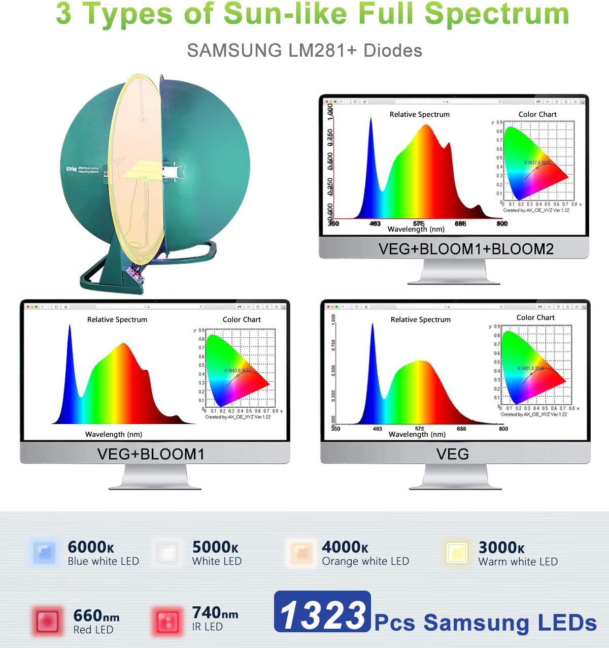 - Full Spectrum Grow Light : Infinitely close to natural sunlight, consists of 660nm Red light, IR 740nm, and 3000K, 4000K, 5000K, 6000K light spectrum. IR is dimmer than other red diodes. 3000K providing more reddish light and the 6000K providing more blueish. The 660nm red and IR light is especially useful during bloom, where it speeds up flowering time and boost yields. Uniformly across the surface and deep into the roots and bottom of canopy for consistent, highest quality flowers.