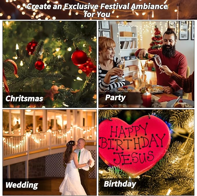 - [Extra-Long & Widely Used Outdoor/Indoor String Lights]-The solar LED string lights are 66FT long, the spacing of LED beads is 10cm, and the lead length is 6FT, which can be easily installed in the place where decoration is needed. It can be molded into various shapes for gardens, courtyards, trees, porches, roofs, fences bistros, restaurants, hotels, commercial buildings. It can also be used in weddings, parties, Christmas, New Year parties to create a warm, joyful and festive ambiance.