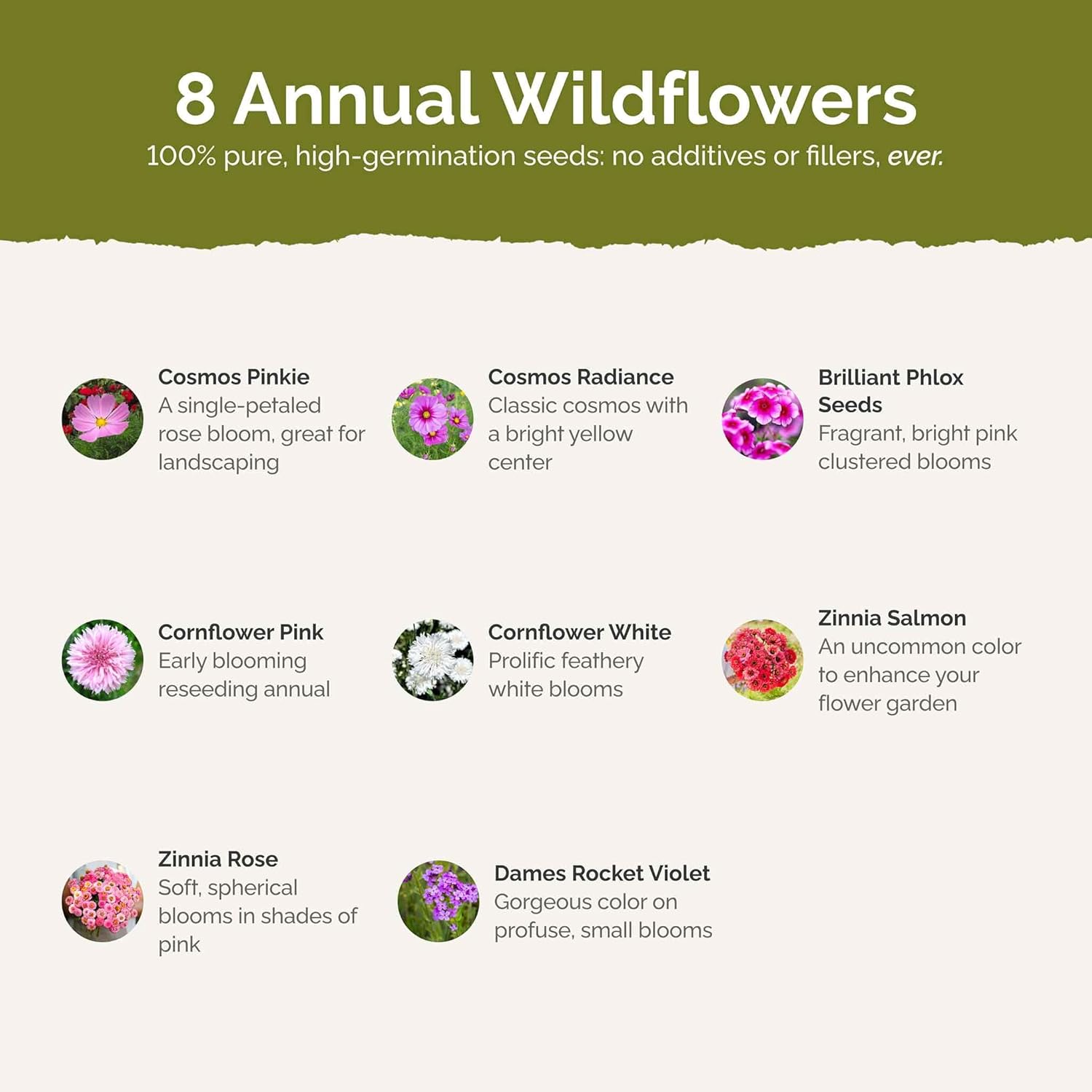 - 100% Pure, Non-GMO Seeds - No fillers, favorites only! Includes 9 easy-to-grow species: Cosmos Pinkie, Cosmos Radiance, Cosmos Purity, Pink Annual Phlox, Pink Cornflower, White Cornflower, Zinnia California Giant, Zinnia Light Pink, Dame's Rocket