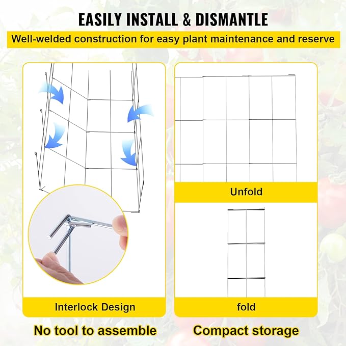 - Foldable & Flexible Combination: The heavy-duty tomato cage can be easily interlocked with the lock on the side, and it can be folded flat into the 1/4 width of each unfolded trellis for off-season compact storage. DIY assemble the folding plant support into different shapes --irregular, half-folded, tiled, and triangle-- to maximally utilize the space of your garden.