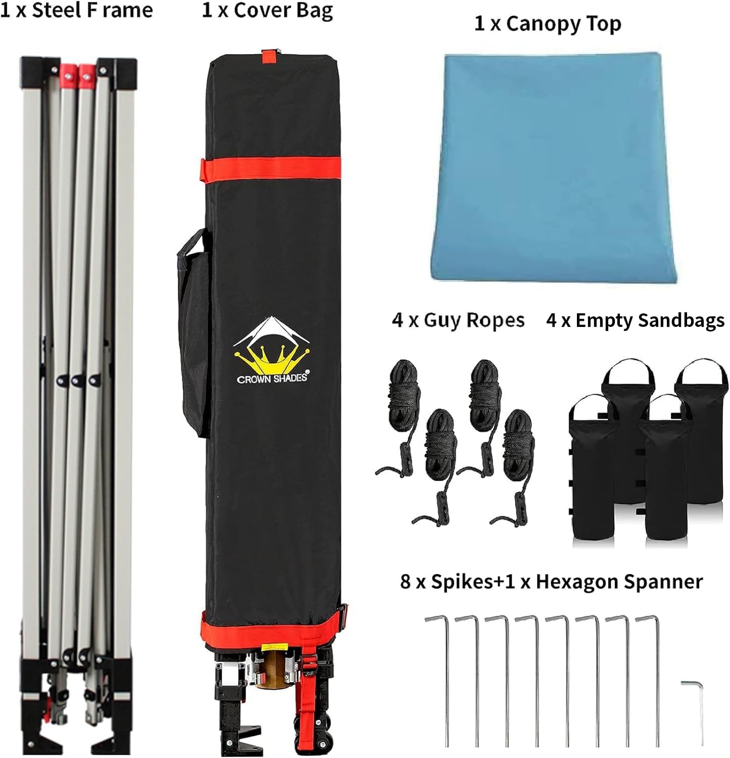 - STO’ N GO SYSTEM - Our lift-free system makes collapsing, storing, and transporting the 10x10 tent a breeze. The 10x10 popup canopy can be stored with the fabric attached, with a specialized pocket for 4 sandbags, 8 stakes, and 4 guy ropes. Integrated wheels in the feet allow easy movement even when the instant shelter tent is set up, by simply lifting the side without wheels. This feature is especially useful for quick setup and takedown at locations like the patio or sports events
