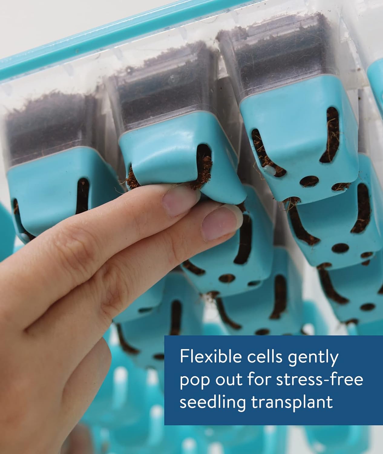 - SMARTER WATERING SYSTEM: Molded corner slots in each cell improve drainage and soil aeration to set your seeds up for germination success. Deep channels in the watering tray draw excess away from the cells, while the raised perimeter edge keeps water contained in the tray - no spills! Seed tray side handles make it easy to lift and pour off excess water or check seedlings daily.