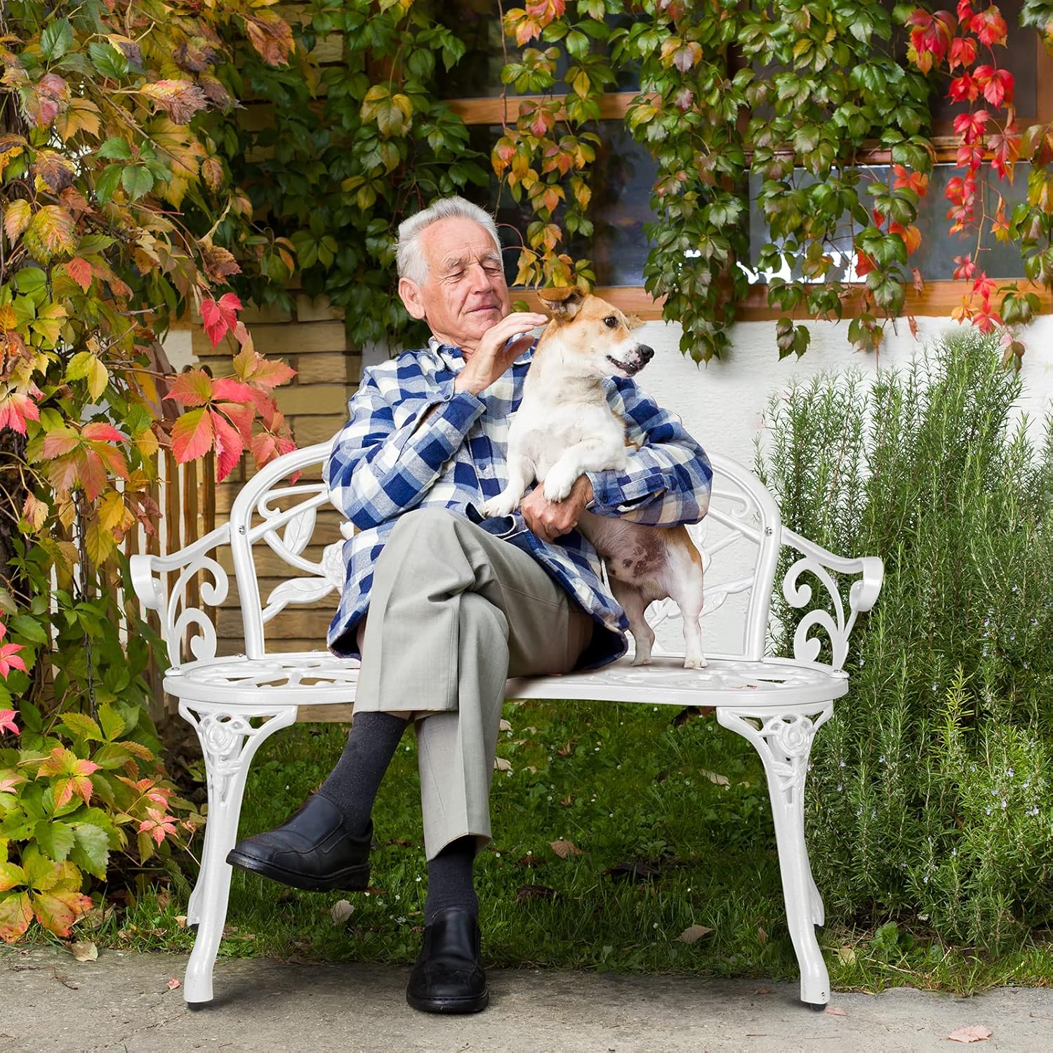 VINGLI 38.5" Patio Park Garden Outdoor Metal Rose Bench,Cast Iron Cast Aluminium Frame Antique Finish Chair,Accented Lawn Front Porch Path Yard Decor Deck Furniture for 2 Person Seat(White