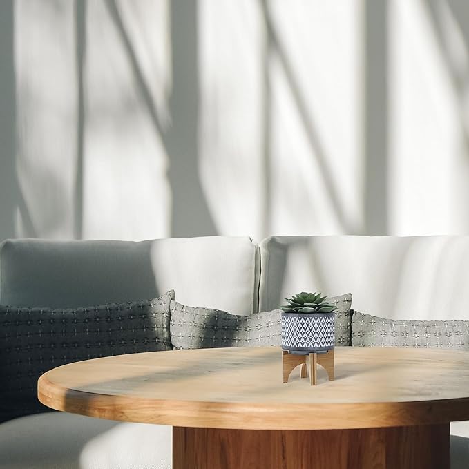 - STYLISH & MODERN DESIGN - Elevate your space with this decorative plant pot featuring a sleek geometric pattern. The ceramic planter sits on a sturdy bamboo stand, adding a touch of elegance to any home, office, or garden decor.