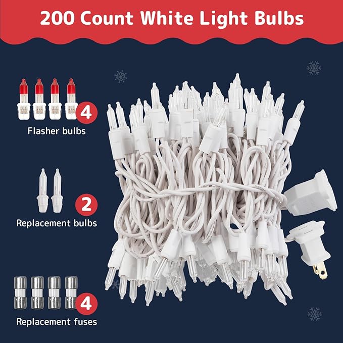 - Complete Holiday Light Set: This 40 ft strand includes 200 white christmas lights with 4 flasher bulbs, 2 replacements, and 4 fuses; provides reliable festive lighting for trees, garlands, and décor