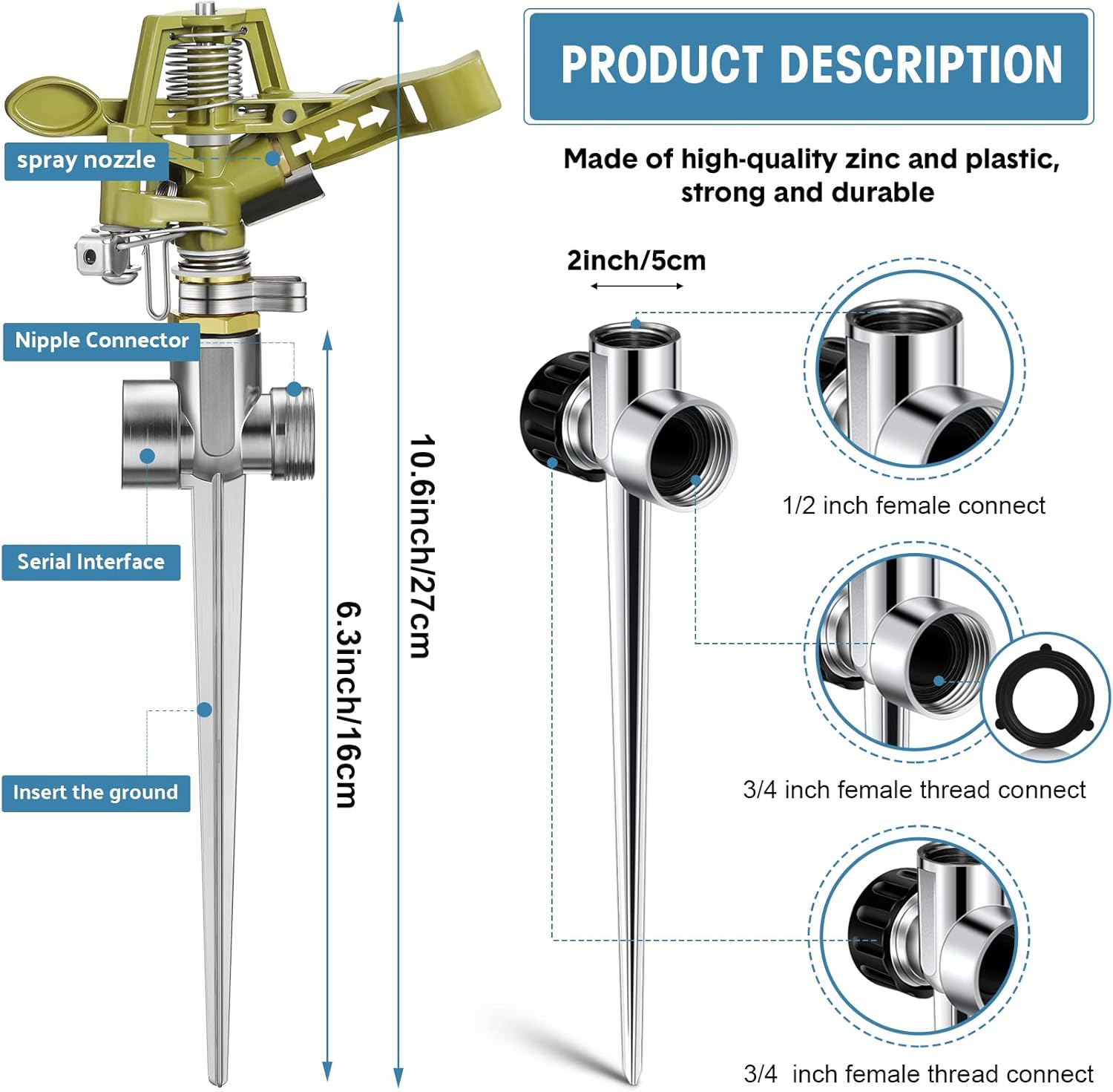 - Large Area Coverage: the lawn sprinkler garden sprinkler is suitable for 1/ 2 inch thread head, featured with 360 degree rotation, watering up to 79 feet in diameter; The water sprinklers can be applied in series which is very suitable for wide area irrigation; Please increase the water pressure before connecting the impact sprinklers in series