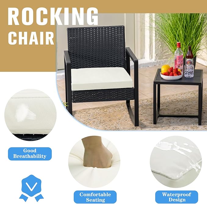 WWR 3 Pieces Outdoor Patio Furniture Set Rocking Wicker Rattan Chair Set Patio Bistro Conversation Set 3 Pcs with Coffee Table for Yard & Bistro (Sand)