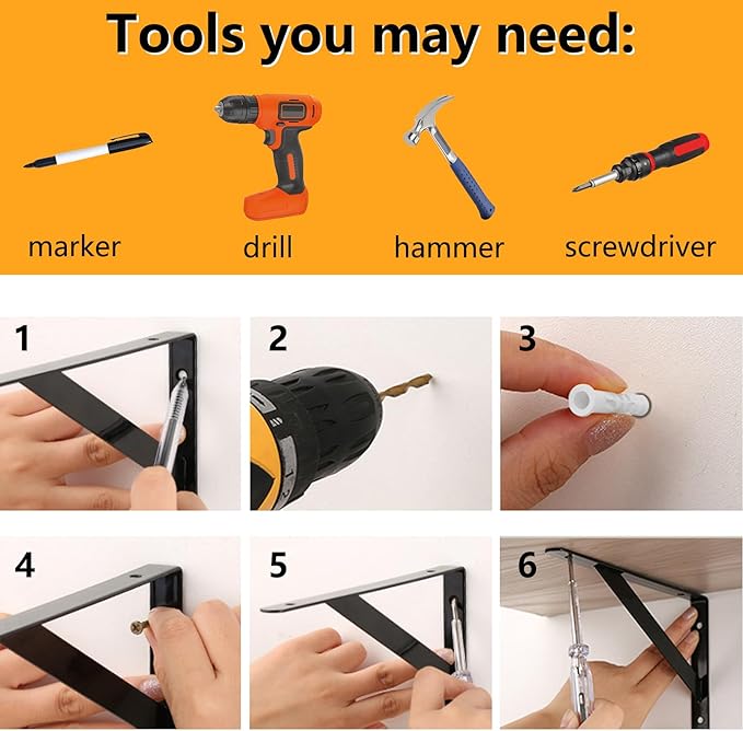 - The metal shelf bracket Includes pre-drilled 1/4" holes on each side. Mounting hardware included- (8 pcs Long Screws; 8 pcs Plastic Anchors; 8 pcs Short Screws)