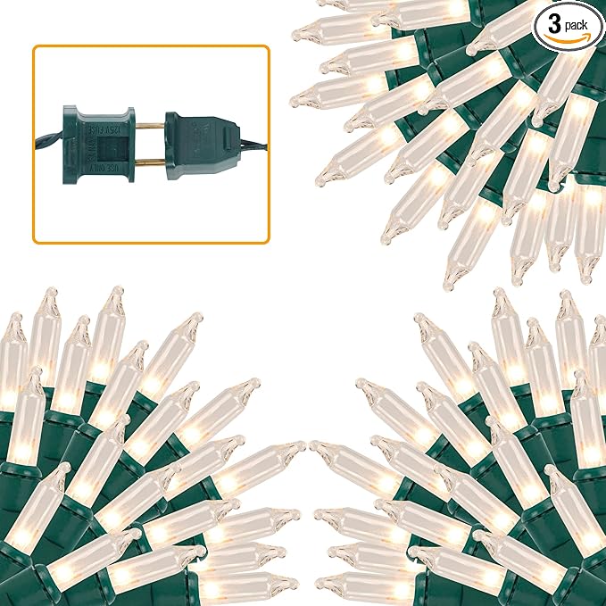 - 3 Pack Green Wire Christmas Lights: Our 3 x 150 count clear warm white incandescent mini lights will light up you home in the coming up Christmas. Each bulb space 2.5in, 2.5V and 0.42W per bulbs, built-in 3A fuse for safe use. Extra bulbs and fuses are included. High quality UL certified products ensure the safety of you and your family
