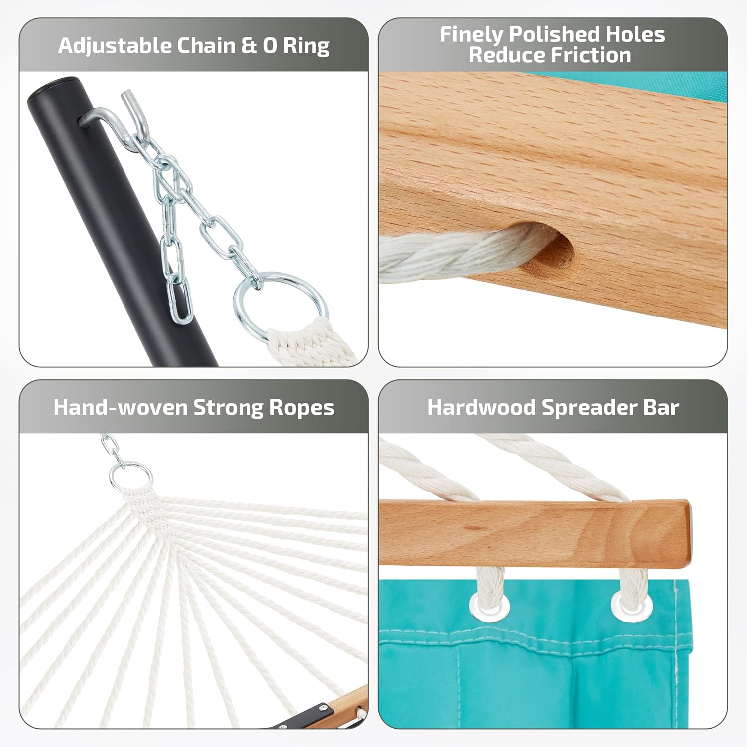 - 【Curved Spreader Bar】The angle of the curved bars make the center of gravity more stable when using. The countersunk spreader bar holes can reduce the friction between rope and wood which make the hammock stands the test of time.