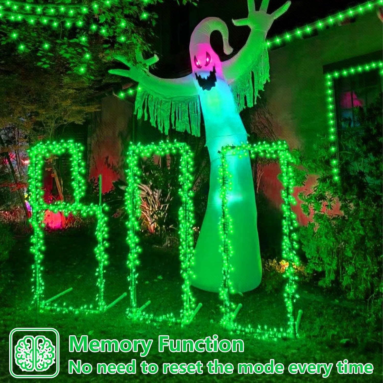 - Brilliant Outdoor Decor Lights: 2 Pack each 200 LED solar string lights with green light accent your space with a unique, inviting glow. 66ft length is perfect to put around a garden or porch railing. Green solar string lights the finishing touch for a back yard bbq, St Patrick's, Christmas, Halloween, party, wreath, fence, patio, pools, bush, holiday, indoor, outdoor. In the dark, the wire fades to invisible, leaving only the fairy lights, create a flicker and mysterious atmosphere.