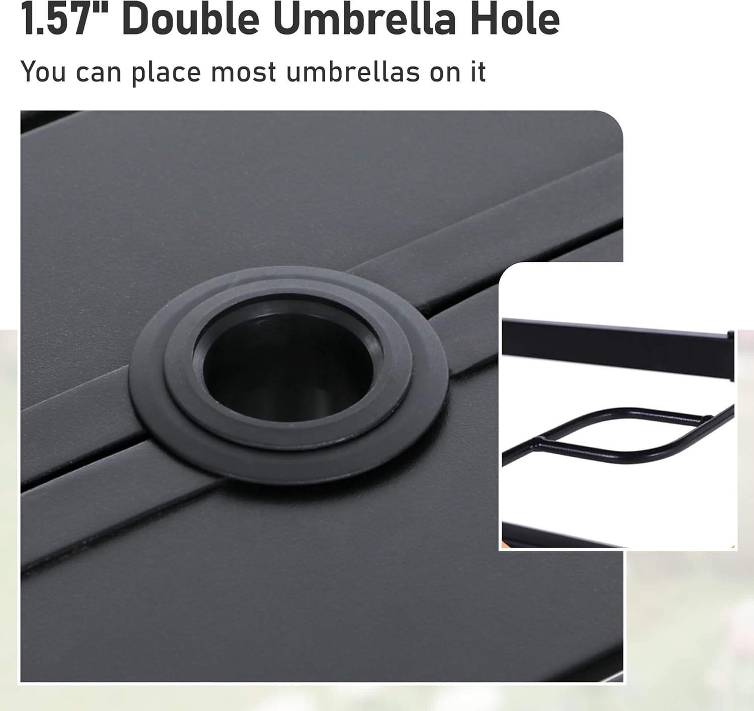 - Square Dining Table: L 37" x W 37" x H 28"; Diameter of umbrella hole:1.57", Suit for 4 people, 1.57" diameter of umbrella hole fits patio umbrellas which can protect you from the bright sun for a better outdoor experience