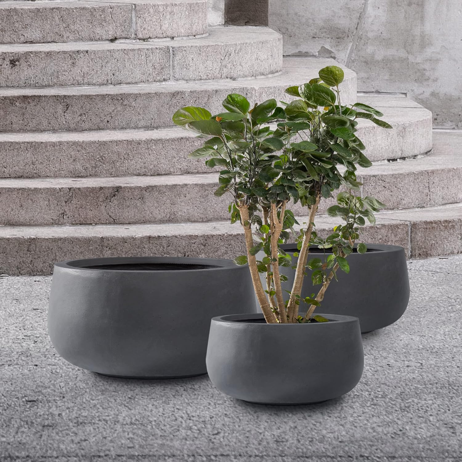 Kante 19.6",15.7",11.8" Dia Round Concrete Planters Set of 3, Outdoor Indoor Garden Plant Pots with Drainage Hole and Rubber Plug, Modern Curvaceous Design, Charcoal