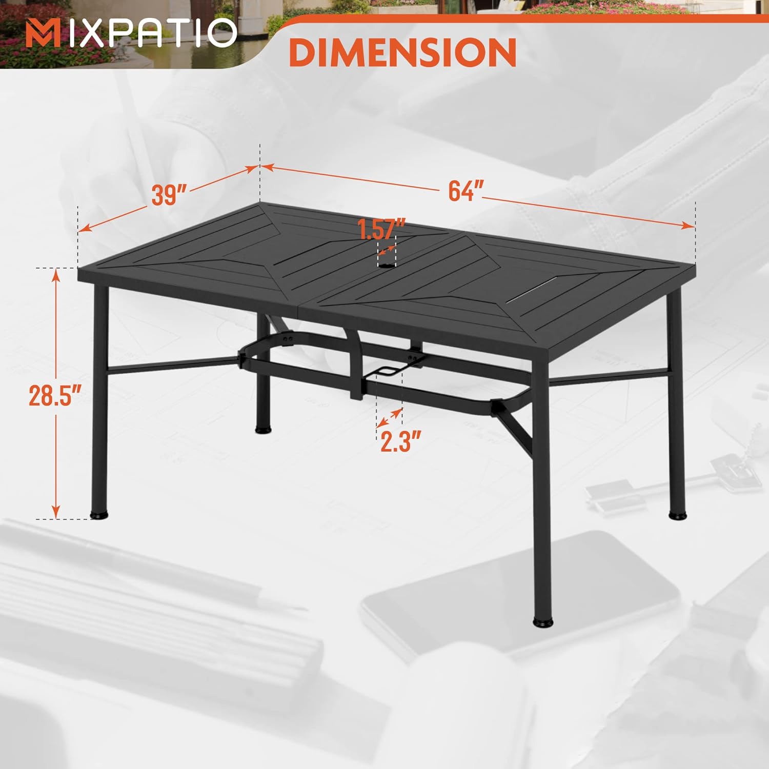- Pario Dining Table: L 64" x W 39" x H 28.5"; Diameter of umbrella hole:1.57", Suitable for 6 people, 1.57" diameter of umbrella hole fits patio umbrellas which can protect you from the bright sun for a better outdoor experience