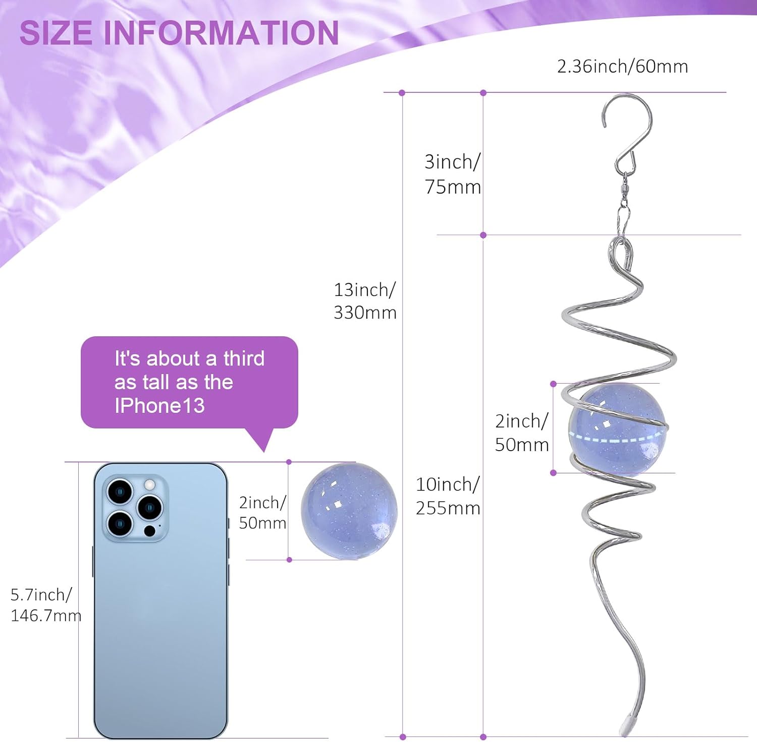 Gazing Ball Spiral Tail, Wind Spinner Stabilizer with Purple Glass Orb | 13-Inch Sun Catcher Rainbow Maker, Mesmerizing Rotating Art for Outdoor Garden Yard | Unique Hanging Decor & Gift