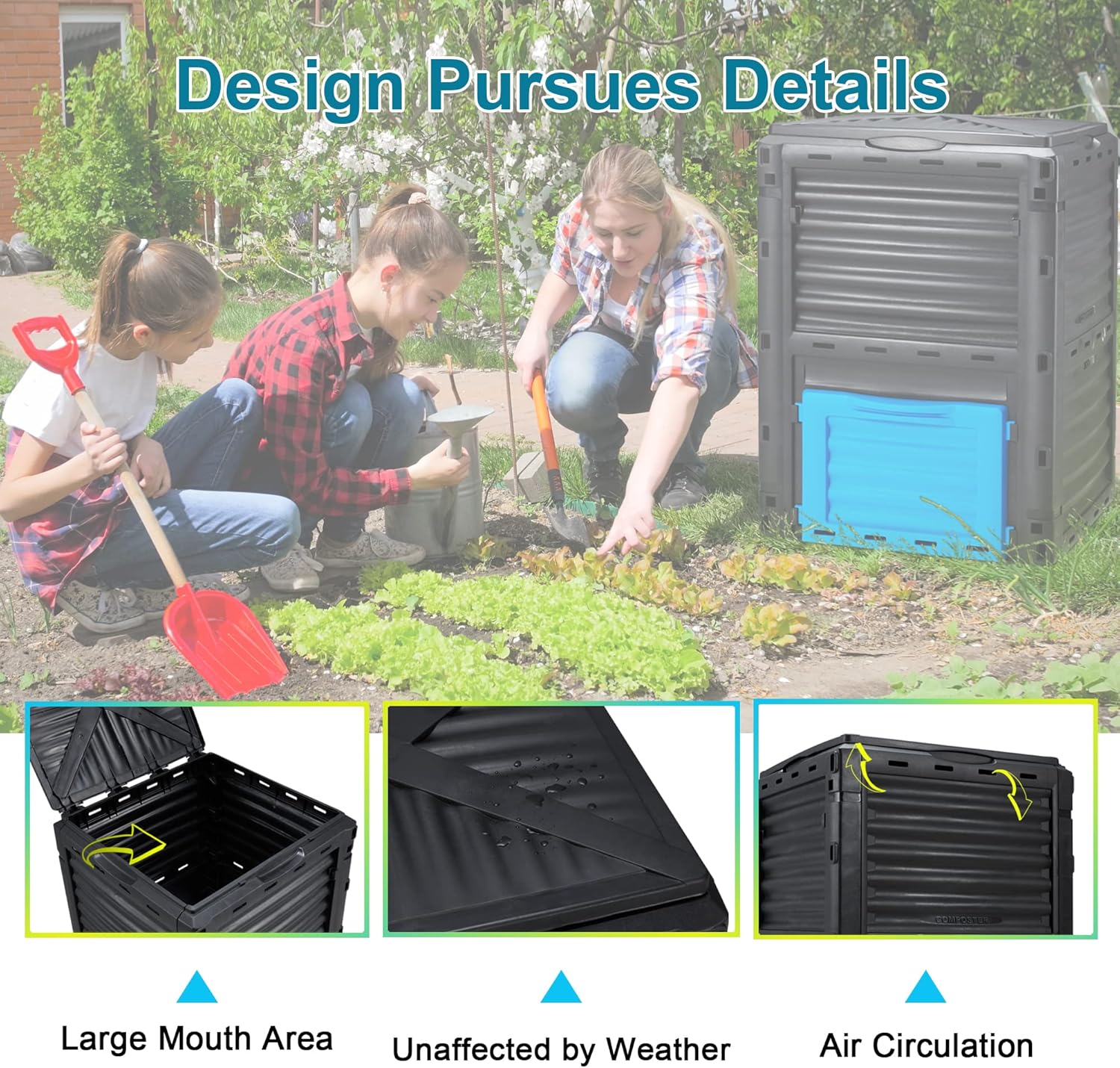 - 🌞【Large Capacity and Opening】: The outdoor composter bucket is up to 80 gallons (300L), which can hold a lot of garbage and reduce your operating frequency. Large opening design, easy to use, you can fill up with organic waste such as old hay, kitchen waste, fallen leaves, etc., and the rich fertilizer produced can fertilize your vegetables and flowers!